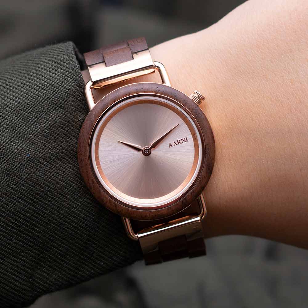 Siro ja säihkyvä. Aarni Saga on upea pähkinäpuinen kello erityisesti naisille. Ruusukultaisten yksityiskohtien myötä tämä kello todella säihkyy ranteessasi.