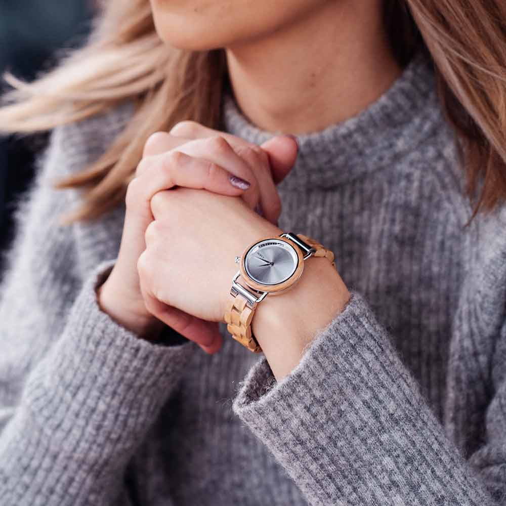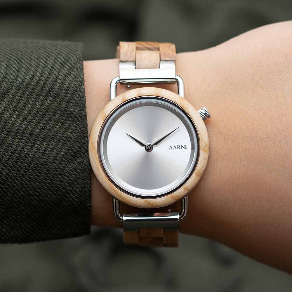 Klassista säihkettä. Aarni Saga on upea kotimaisesta saarnesta valmistettu kello erityisesti naisille. Hopeiset yksityiskohdat sopivat hyvin yhteen muiden samansävyisten korujen kanssa.