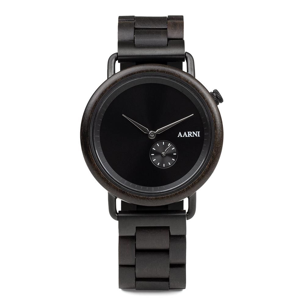 Mieleenpainuvaa tyyliä. Aarni Siriuksen upea ja selkeä muotoilu asettaa riman korkealle. Lähes musta ulkoasu täydentyy hopeisilla viisareilla ja pienellä sekuntinäytöllä.