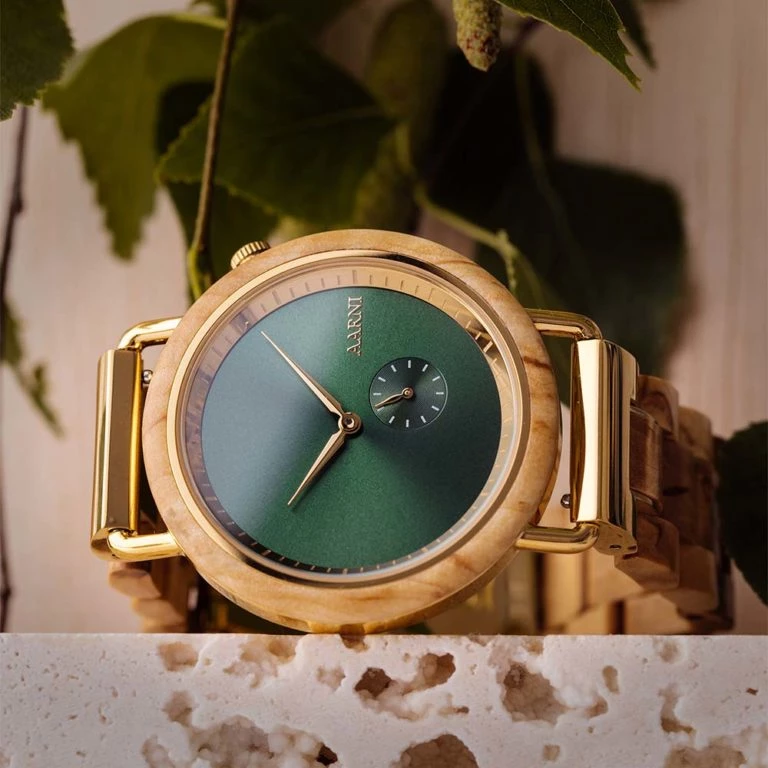 Kotimaisesta visakoivusta. Aarni Siriuksen upea ja selkeä muotoilu asettaa riman korkealle. Kullan väriset yksityiskohdat sekä pieni sekuntinäyttö vangitsevat katseen.