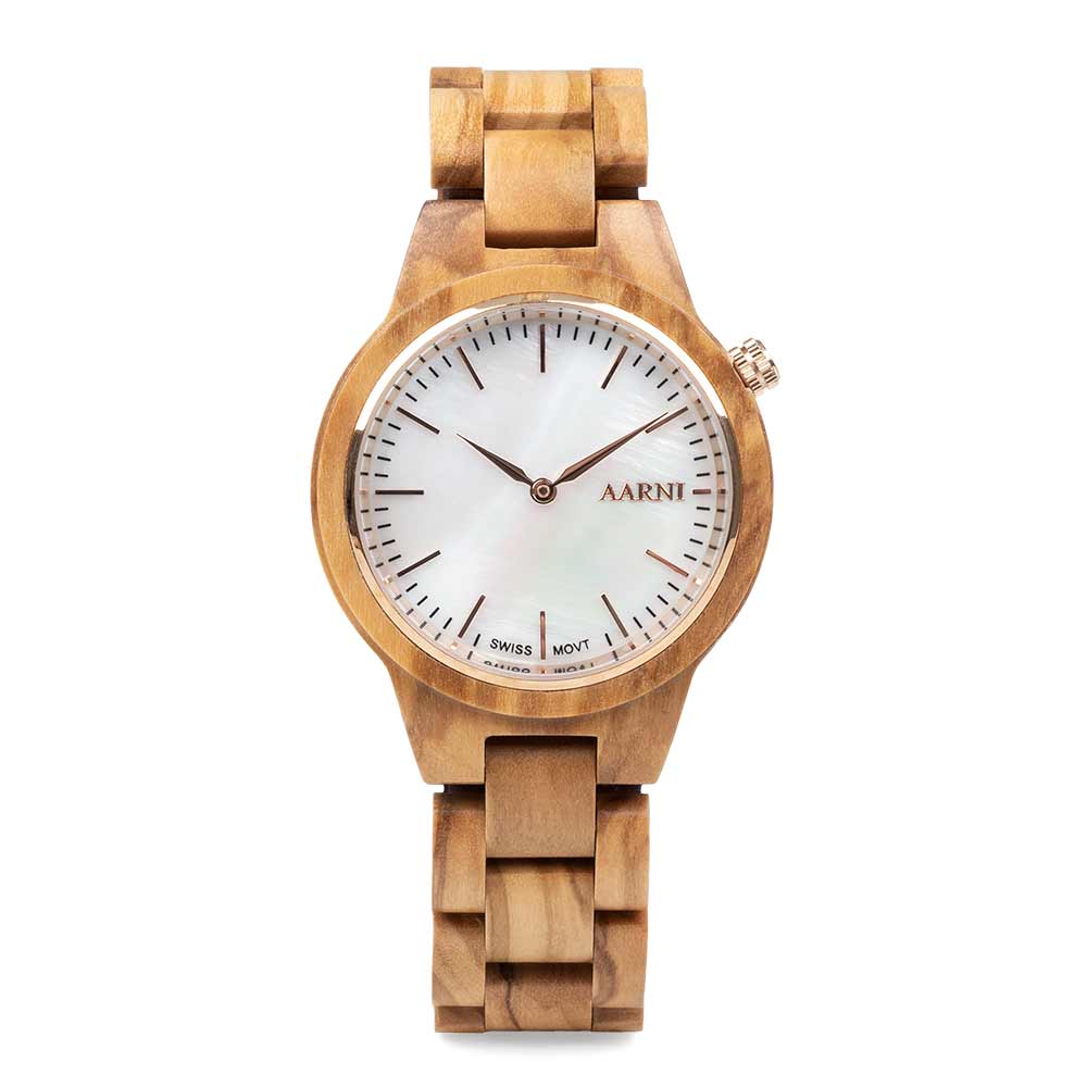 Arvokkaasti hempeä. Aarni Vega tuo yhteen ilmeikkään oliivipuun ja kauniin valkoisen kellotaulun, joka heijastelee valoa simpukankuoren tavoin. Kellon sydämenä toimii tarkka ja laadukas sveitsiläinen Ronda-koneisto.