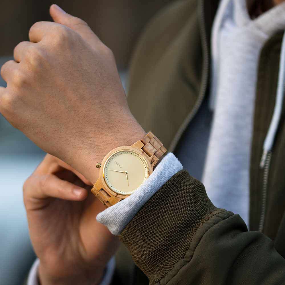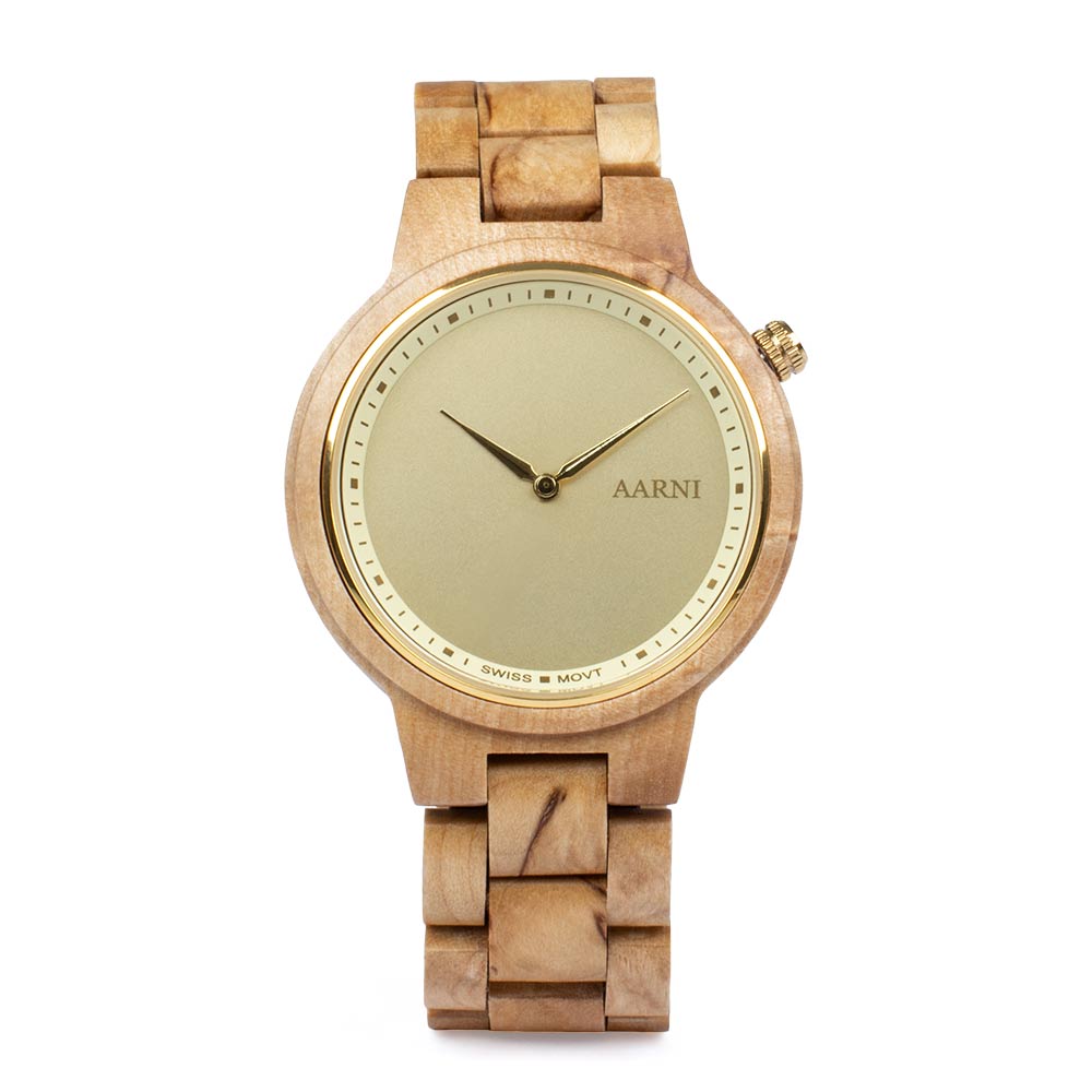 Arvokasta kotimaista. Suomalaisesta visakoivusta valmistettu Aarni XO on elegantti rannekello Sinulle, joka etsit ainutlaatuista kelloa. Kultaiset yksityiskohdat yhdistettynä ohueen koteloon tekevät tästä mallista todellisen katseenvangitsijan, joka sopii erinomaisesti sekä miesten että naisten ranteeseen. Kellon sydämenä toimii tarkka ja laadukas sveitsiläinen Ronda-koneisto.