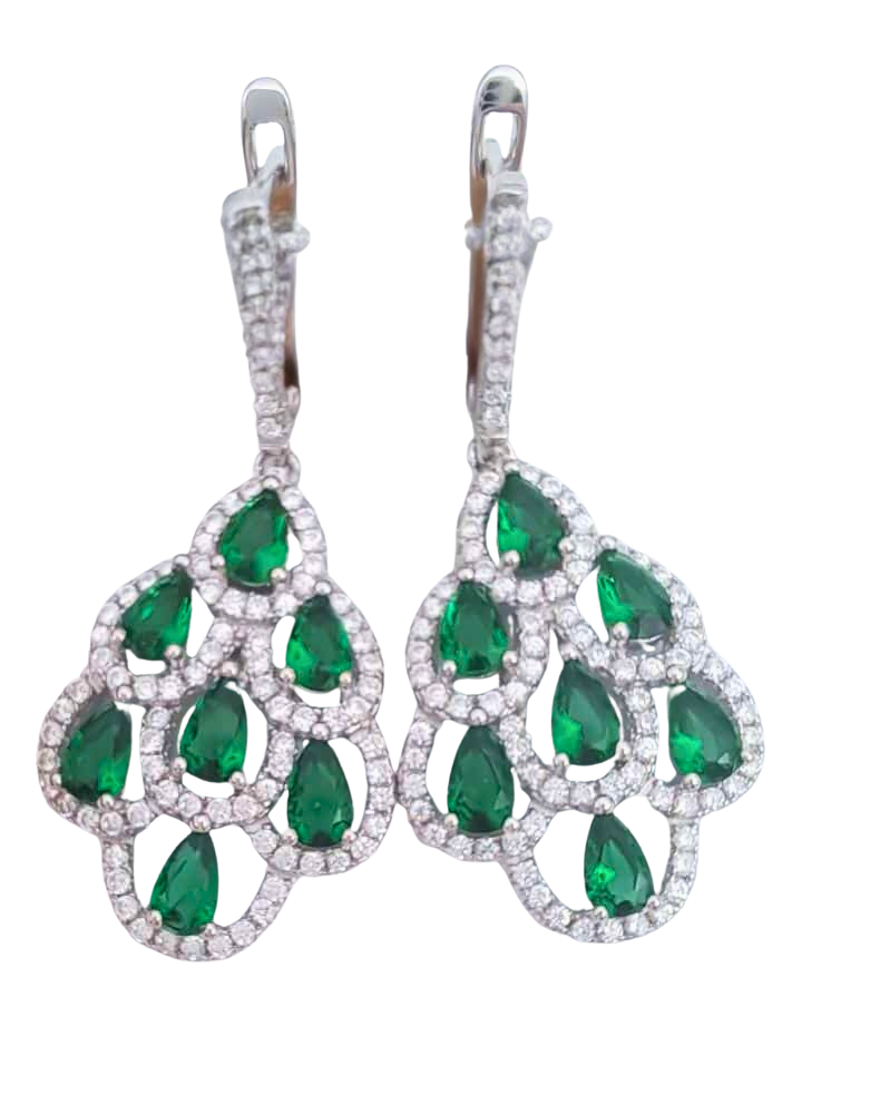 Upeat saranalukituksella olevat korvakorut. Koruissa vihreitä ja kirkkaita zirkoniakiviä.
