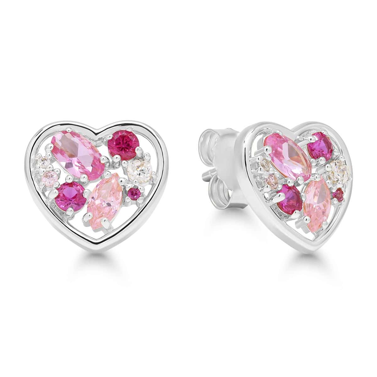 Beat of Love malliston sydämenmuotoiset hopeakorvakorut, joissa on punaisilla rubiineilla ja erivärisillä vaaleanpunaisilla synteettisillä safiireilla ja valkoisella zirkoneilla.