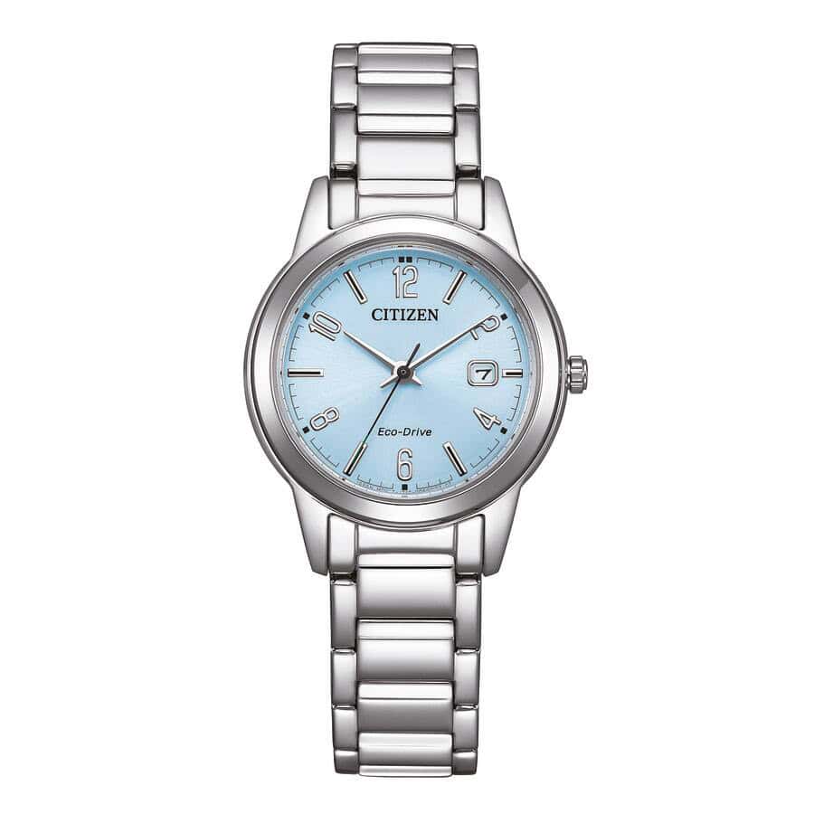 Klassisen tyylikäs naisten Citizen Eco-Drive-rannekello vaalean sinisellä kellotaululla ja hopean värisellä teräs rannekkeella sekä kuorella.