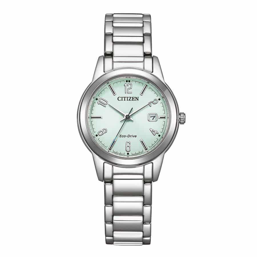 Klassisen tyylikäs naisten Citizen Eco-Drive-rannekello vaalean vihreällä kellotaululla ja hopean värisellä teräs rannekkeella sekä kuorella.