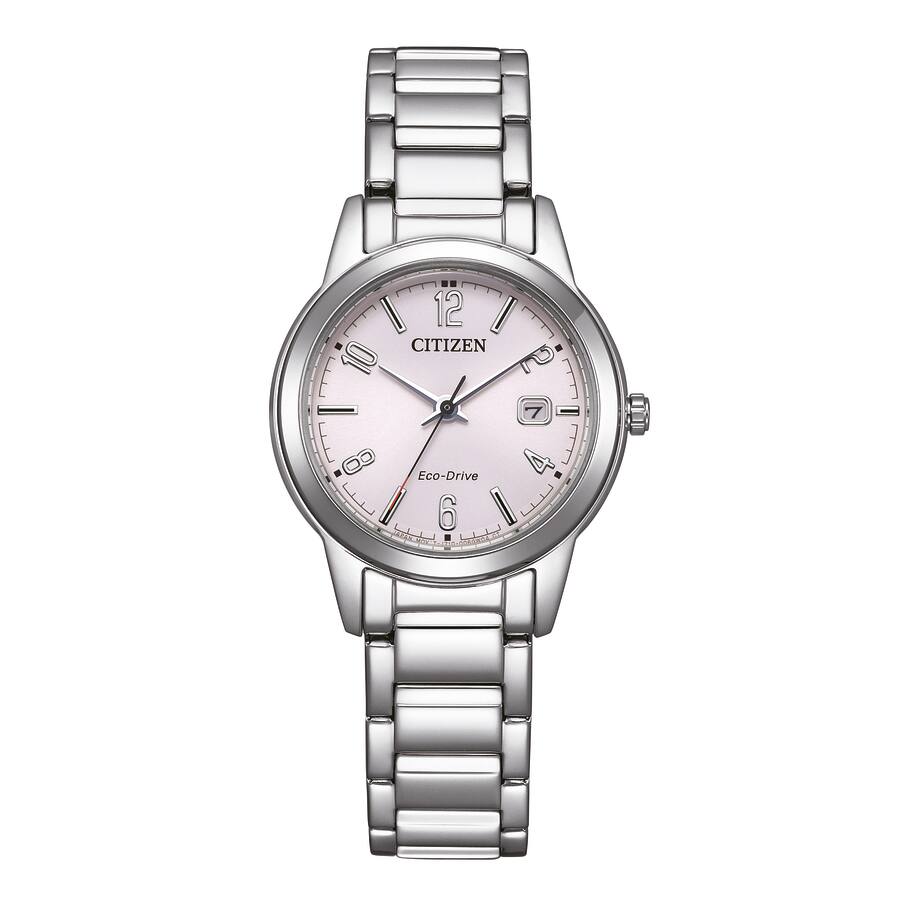 Klassisen tyylikäs naisten Citizen Eco-Drive-rannekello vaalean punaisella kellotaululla ja hopean värisellä teräs rannekkeella sekä kuorella.