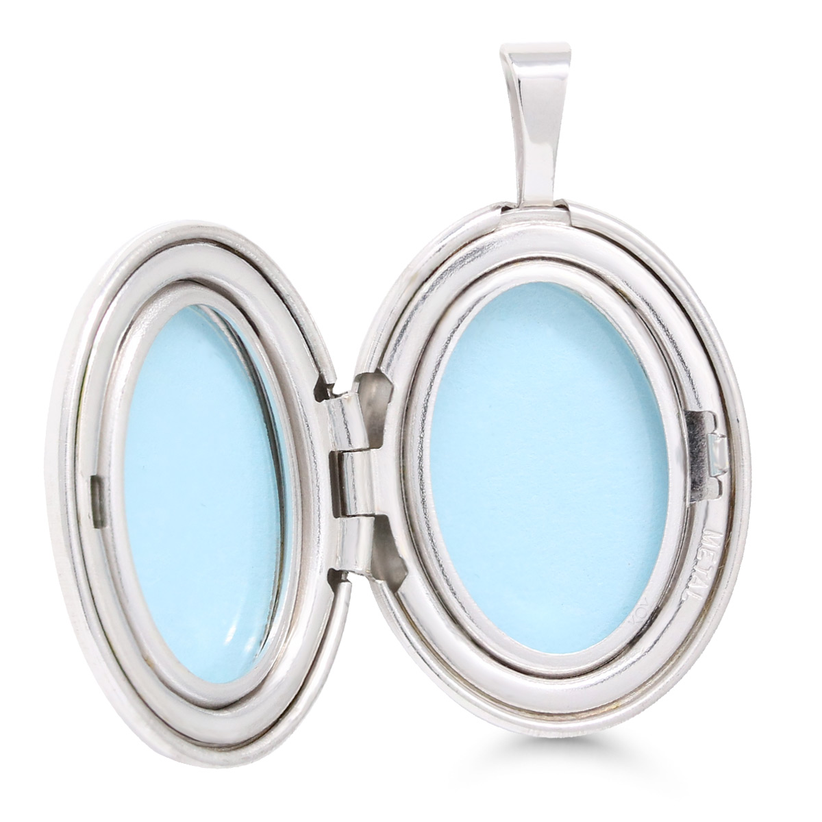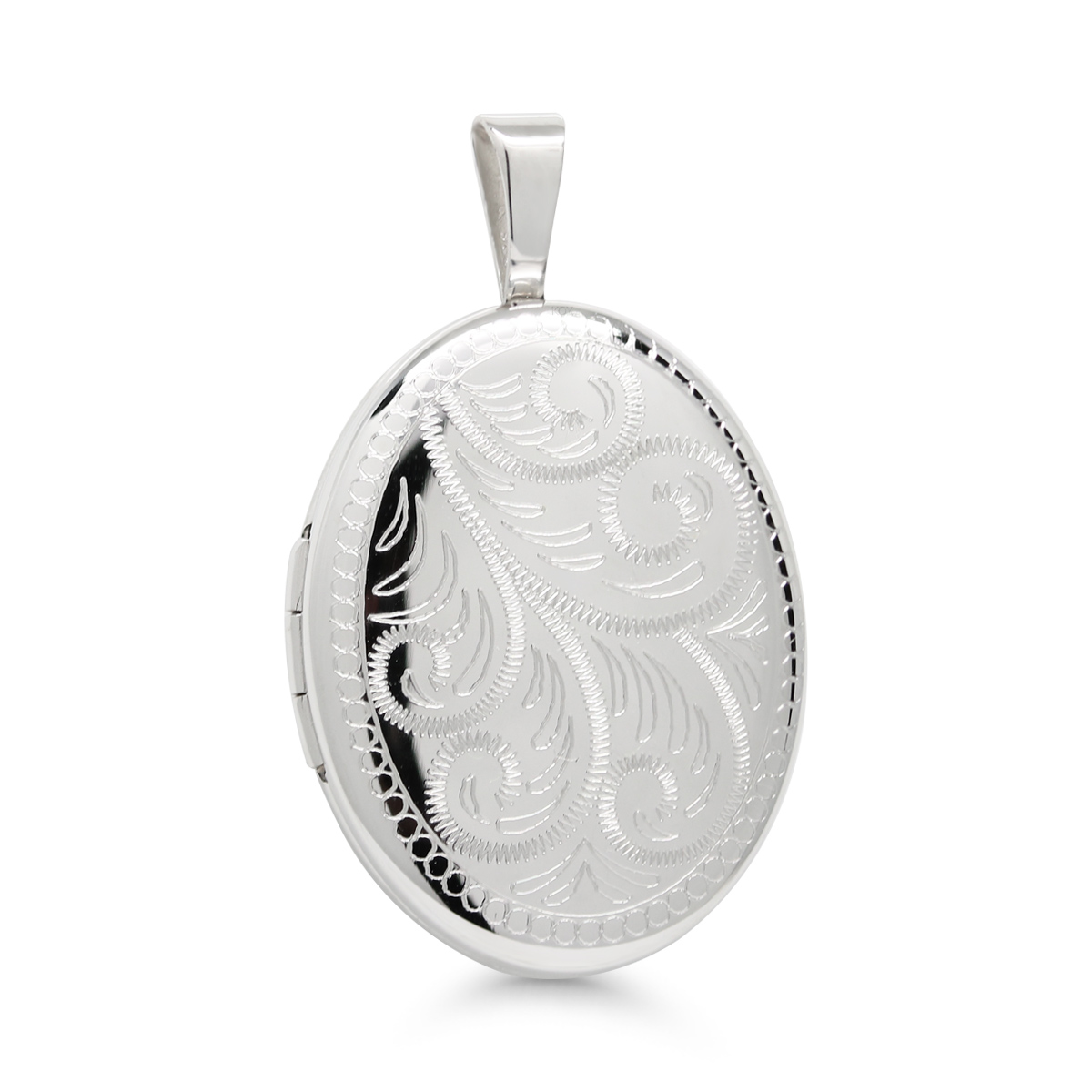 Hopeinen ovaalin muotoinen medaljonki kaiverruksella, tilaa kahdelle kuvalle.