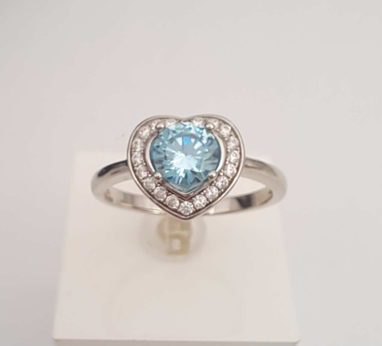 Tyylikäs sydänsormus, jossa koristeena aito vaaleansininen akvamariinikivi.