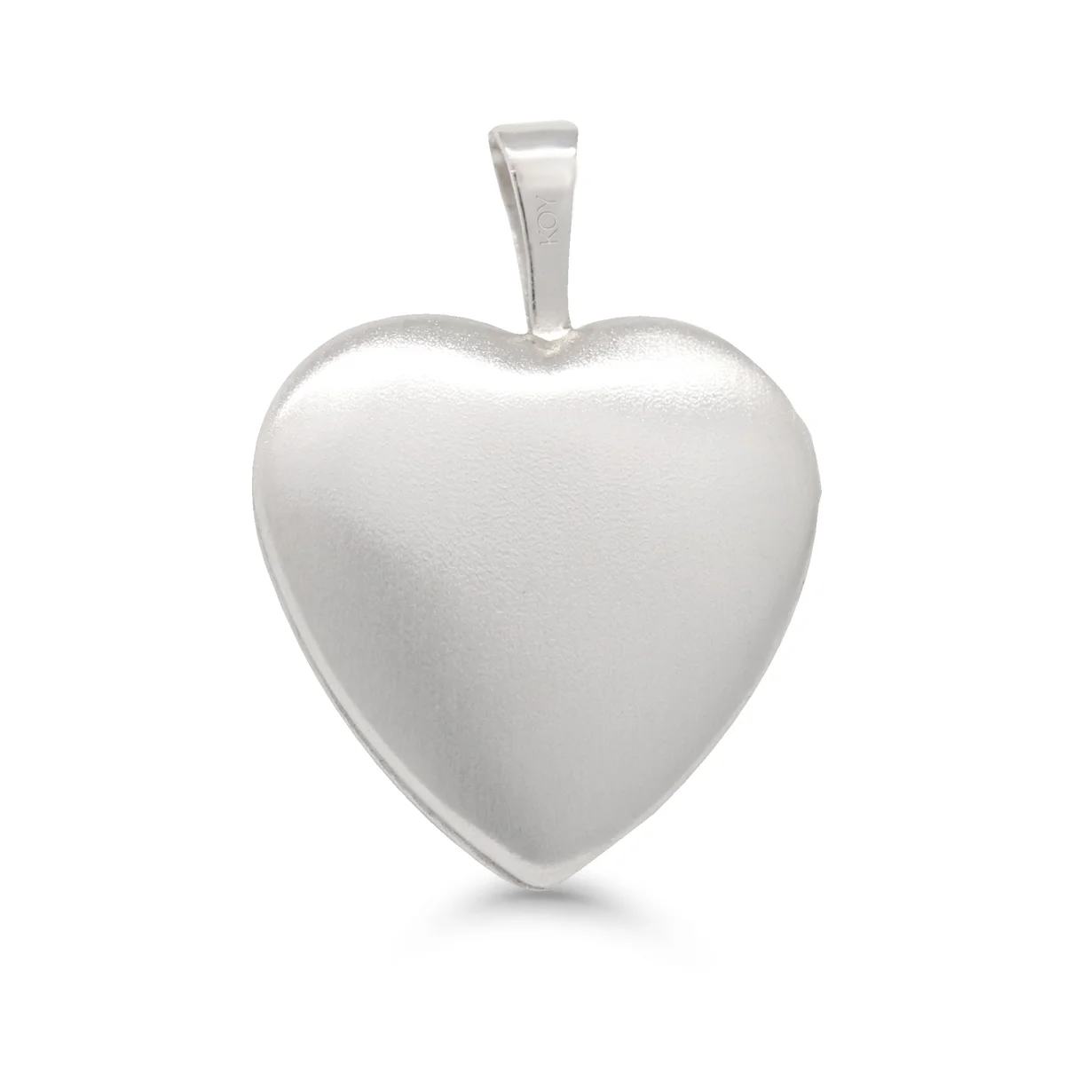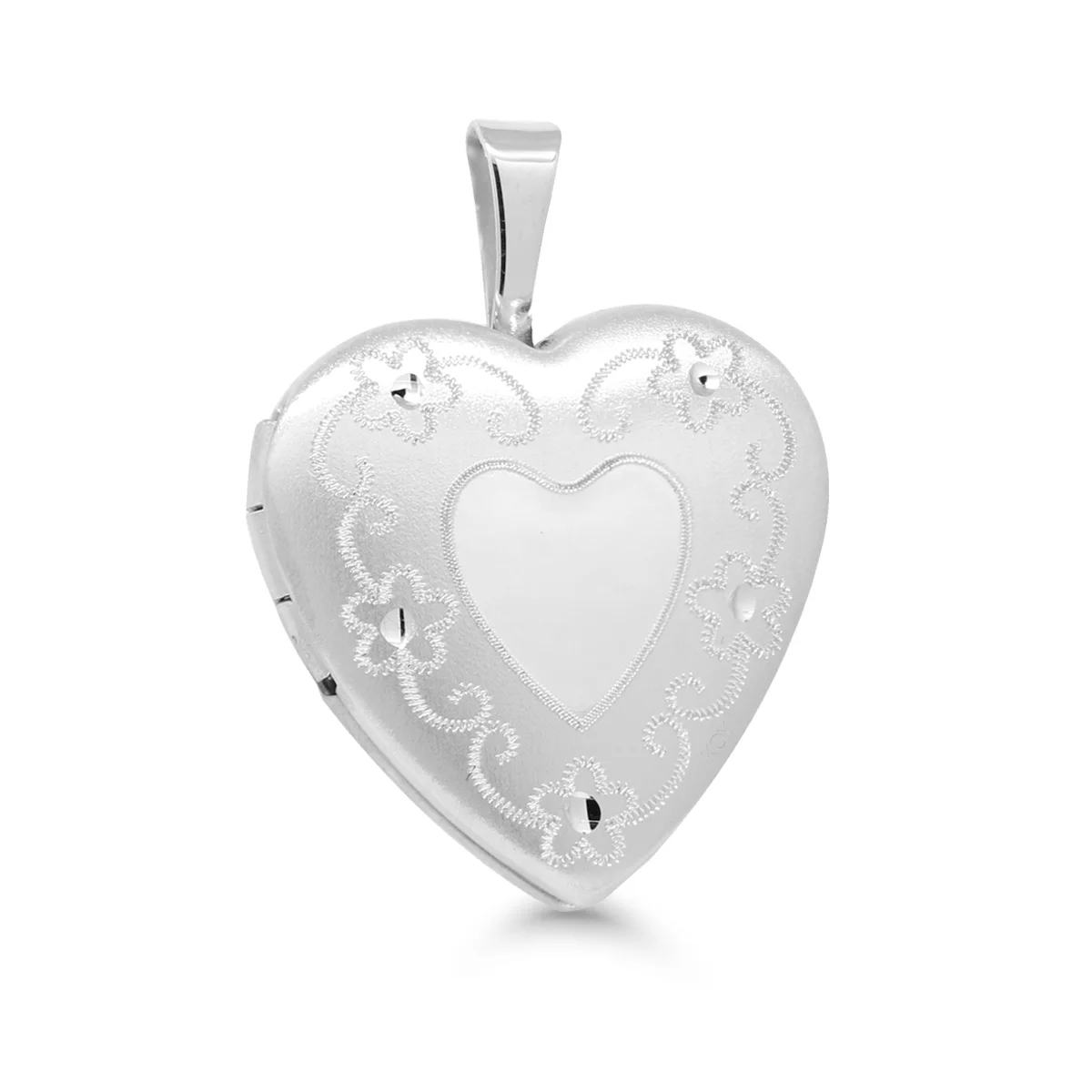Sydämen muotoinen hopeinen medaljonki sydän, kukat ja köynnös kaiverruksella, tilaa kahdelle kuvalle.