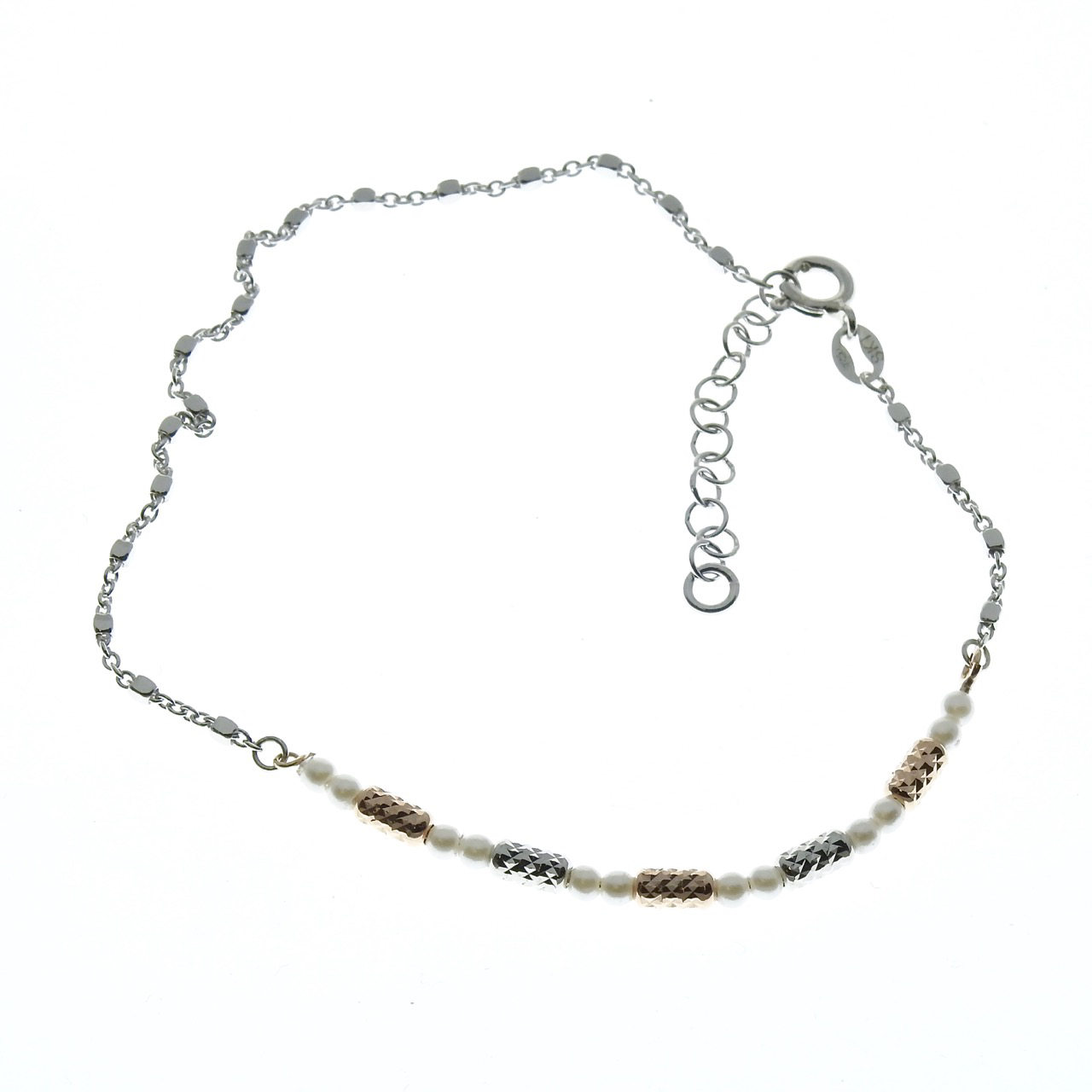 Hopeinen nilkkaketju, jossa koristeena ruusukullan ja hopeanvärisiä heloja. Välissä myös valkoisia helmiä.