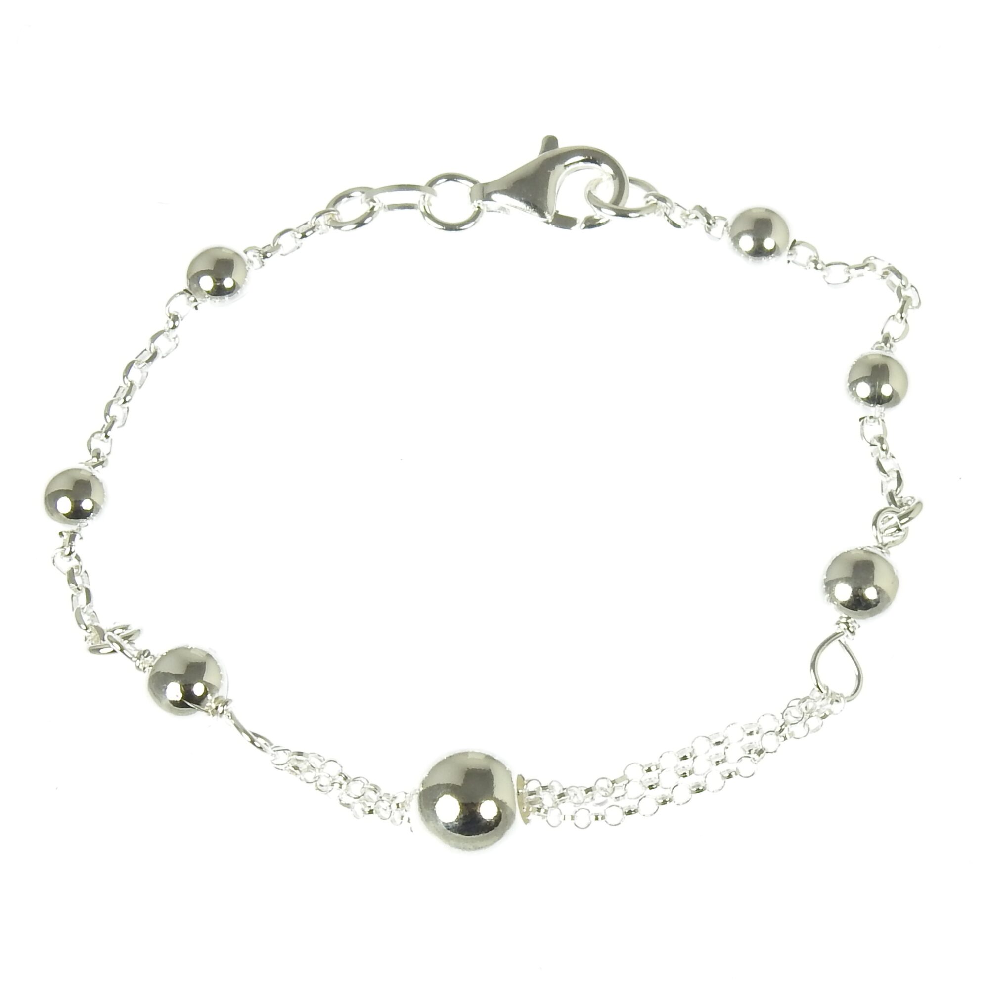 Kaunis hopeinen ranneketju, jossa koristeena erikokoisia palloja.