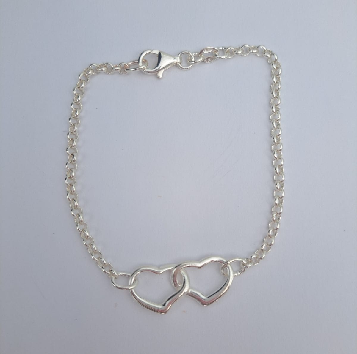 Ihastuttava hopeinen rannekoru, jossa koristeena kaksi sydäntä.
