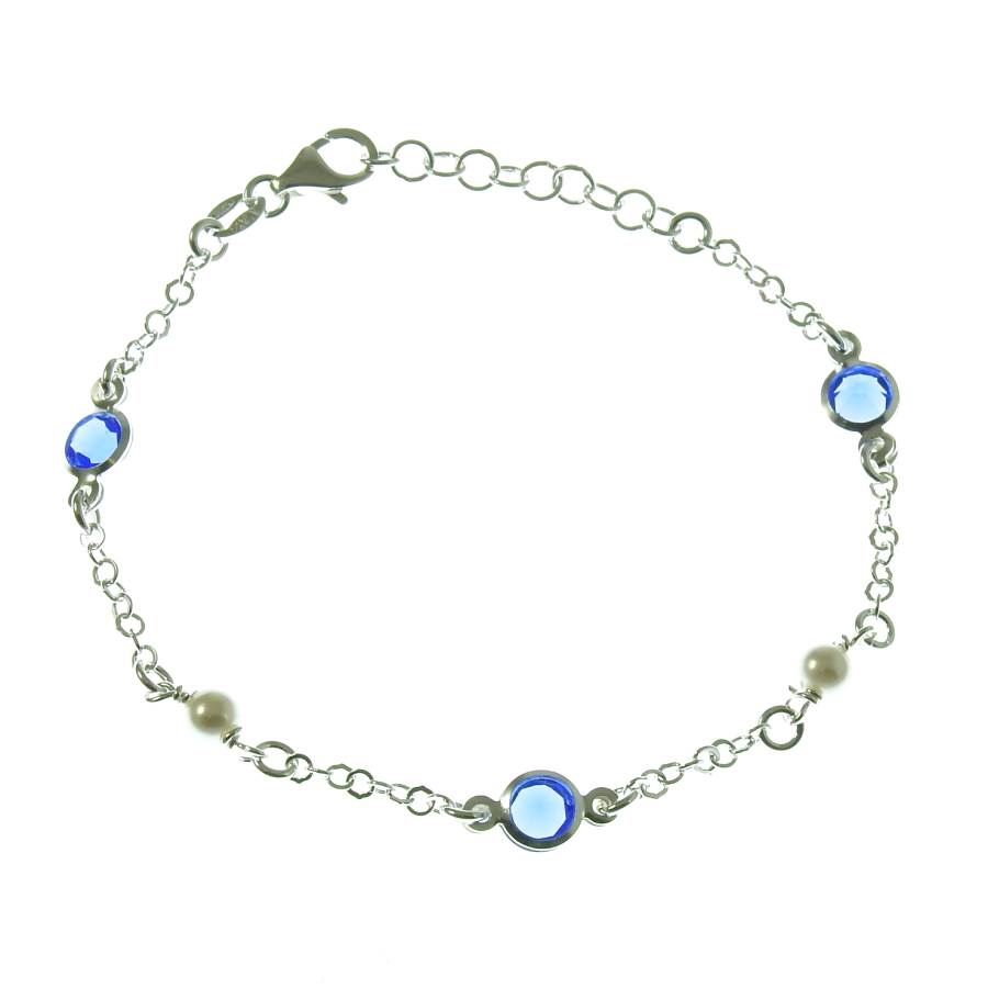 Hopeinen rannekoru, jossa koristeena sinisiä kiviä ja valkoisia helmiä.