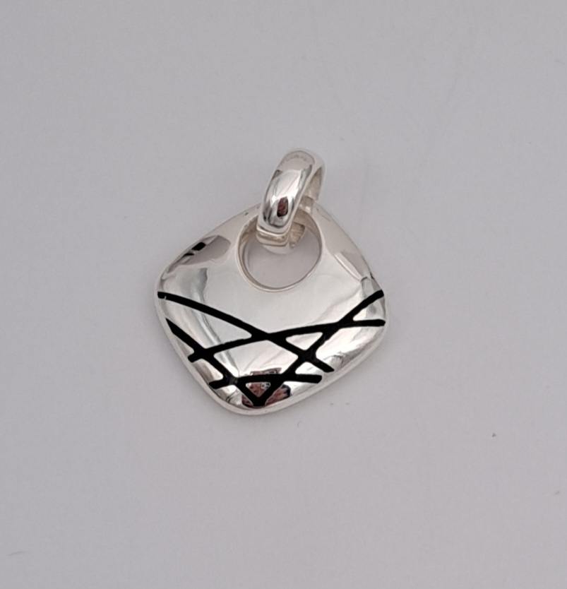 Hieno kirkasta hopeaa oleva riipus mustilla yksityiskohdilla.