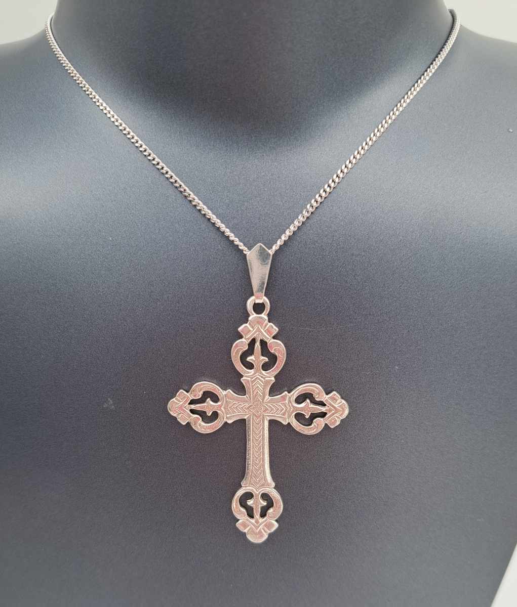 Koristeellinen ja näyttävä hopeaa oleva ristiriipus.