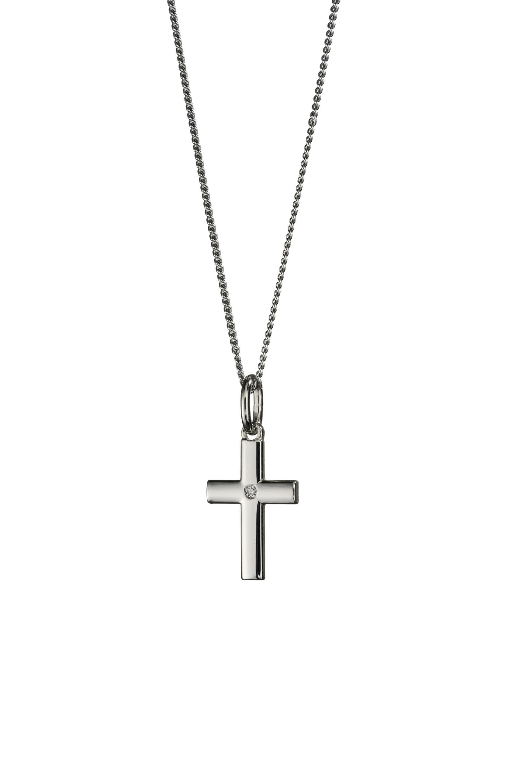 Siro hopeinen rippiristi. Ristissä kiiltävä pinta, keskelle on istutettu 1 timantti. Timantin koko 0,01 ct W/Si