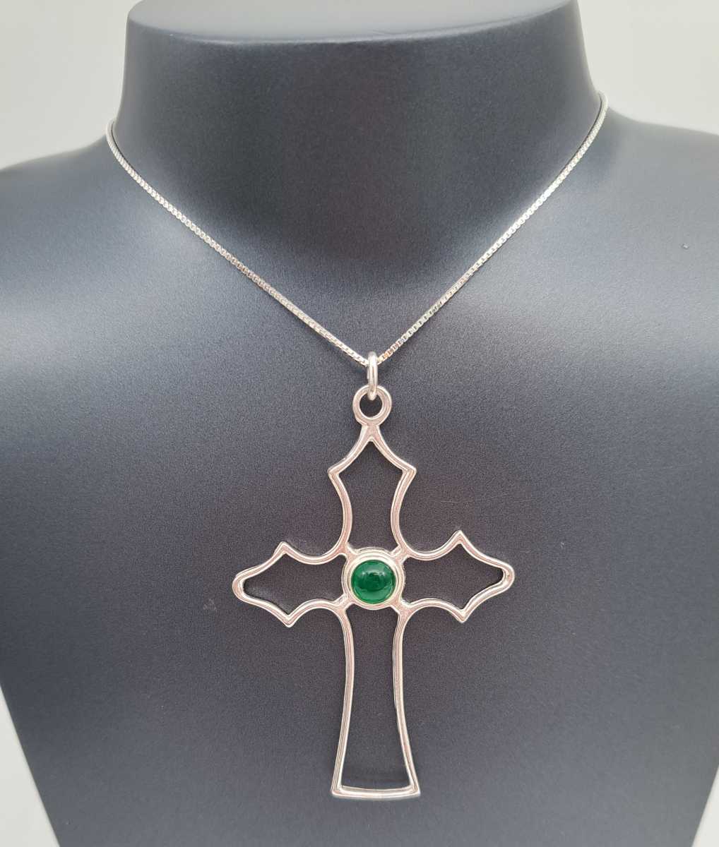 Näyttävä ristiriipus, jossa keskellä aito vihreä akaatti.