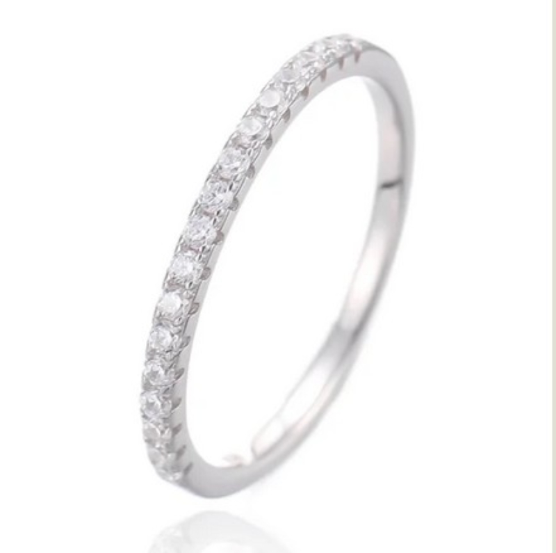 Ihastuttava hopeinen sormus, jossa rivissä kirkkaita zirkoniakiviä.