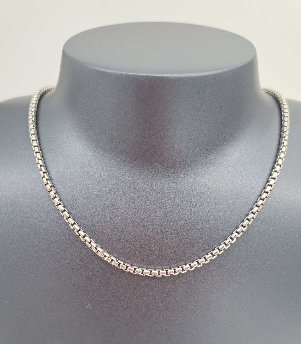 Hopeinen venetsiaketju riipusketjuksi näyttäväänkin riipukseen. Ketju on rodioitua hopeaa.