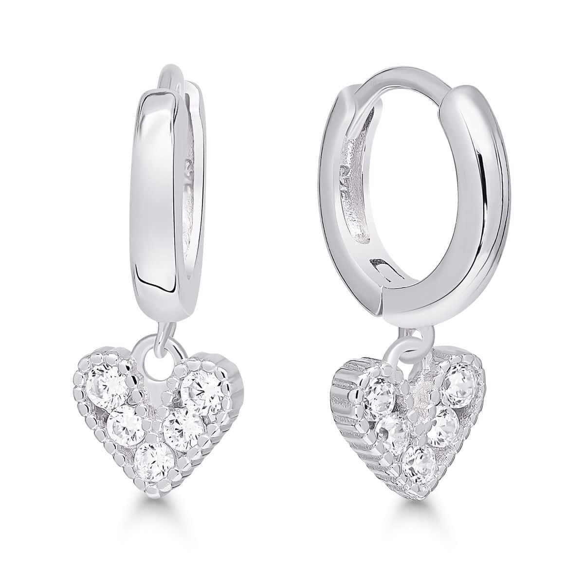 Hopeakorvakorut, joista roikkuvat kauniisti zirkoneilla koristellut sydämet.
