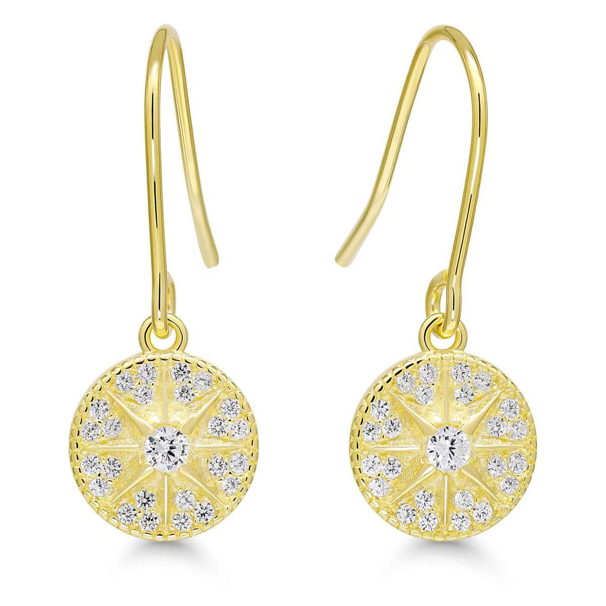 Hopeiset koukkukorvakorut, tähtikuvio pyöreällä taustalla