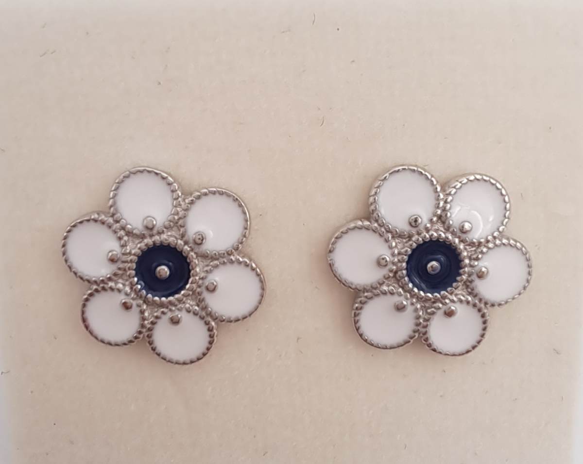 Ihastuttavat emalipinnalla olevat, valkoiset kukkakorvakorut. Koristeena sinistä emalia ja hopeaa.