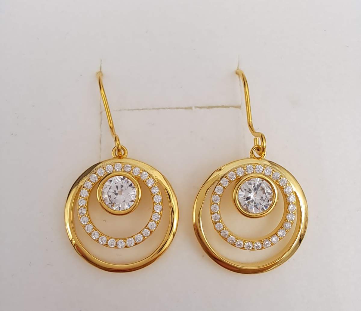 Kauniit kullatut hopeakorvakorut joissa kirkkaat zirkoniakivet koristeena.
