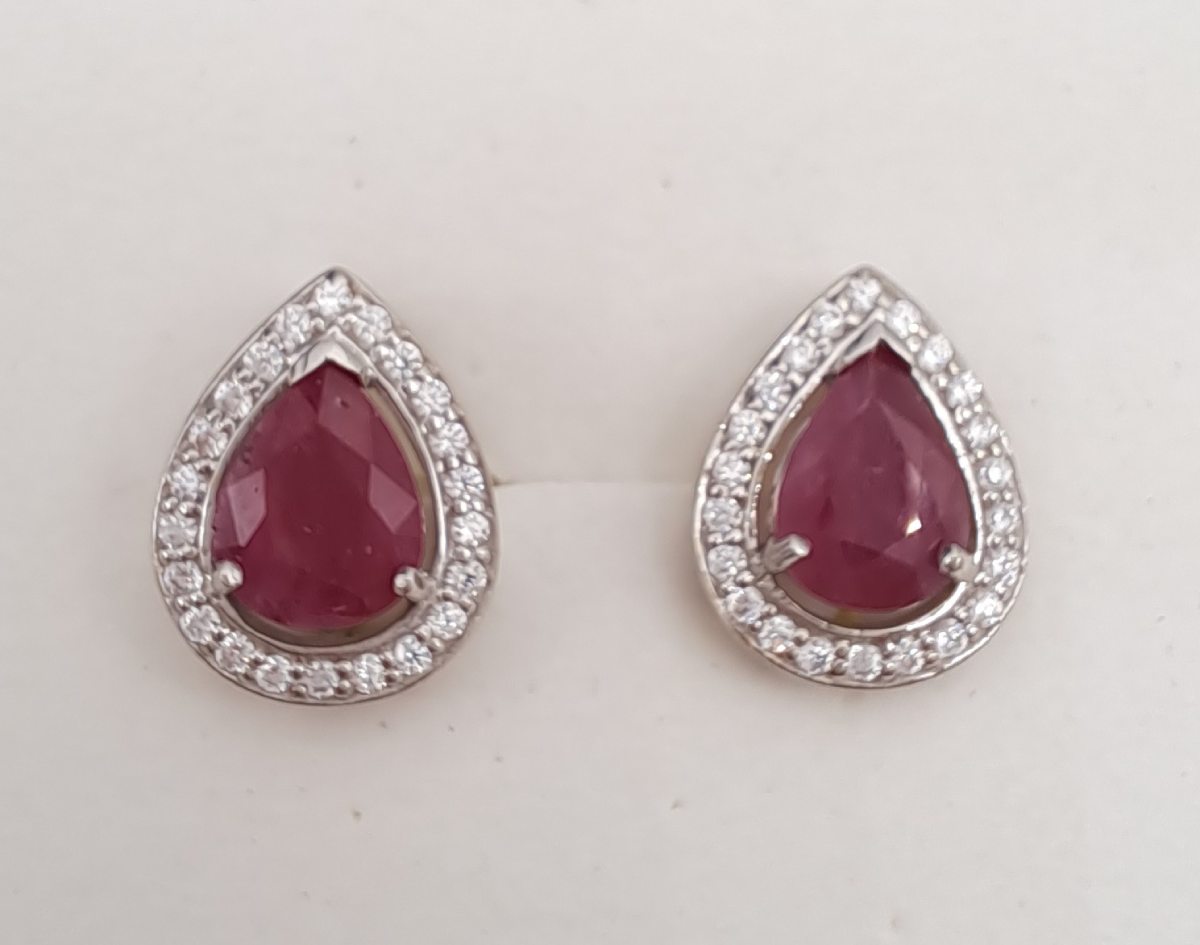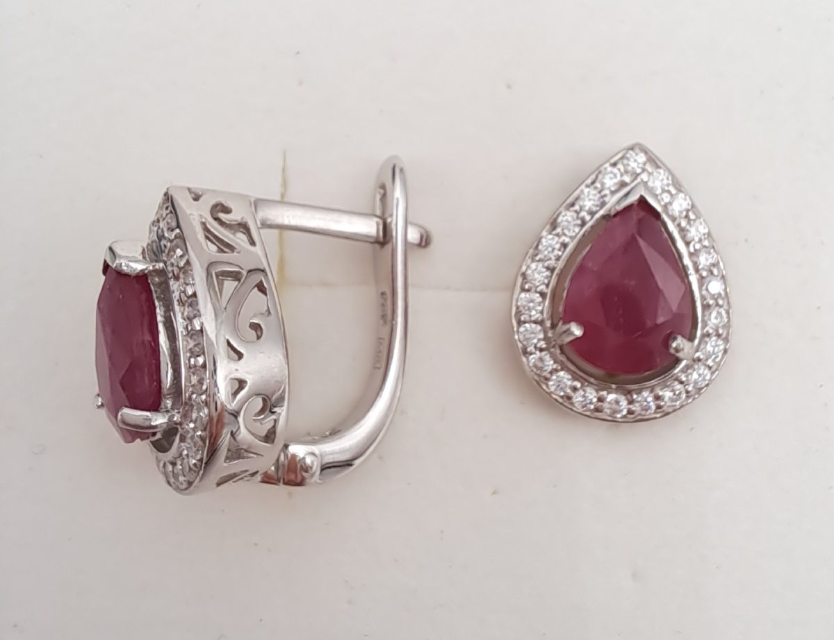 Upeat hopeiset korvakorut aidolla, isolla rubiinilla. Koristeena lisäksi kirkkaita, kimaltavia zirkoniakiviä.