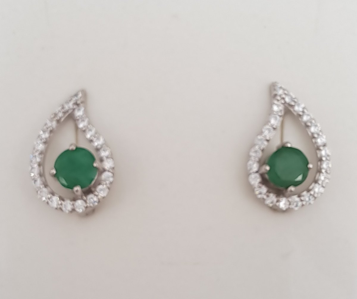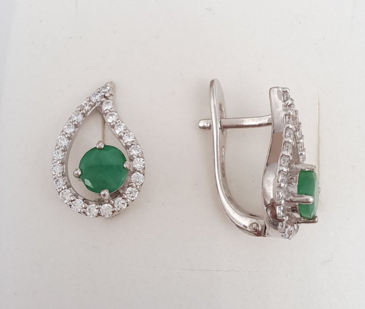 Upeat hopeiset korvakorut aidolla, isolla smaragdilla. Koristeena lisäksi kirkkaita, kimaltavia zirkoniakiviä.