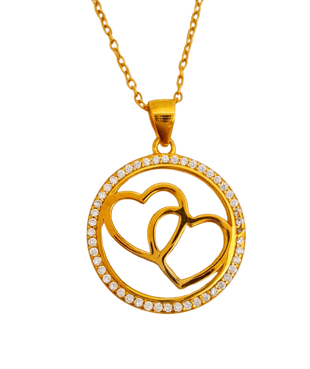 Ihastuttava kaulakoru, jossa pyöreän kehän sisällä kaksi sydäntä. Kehässä kimaltelevat kirkkaat zirkoniakivet.