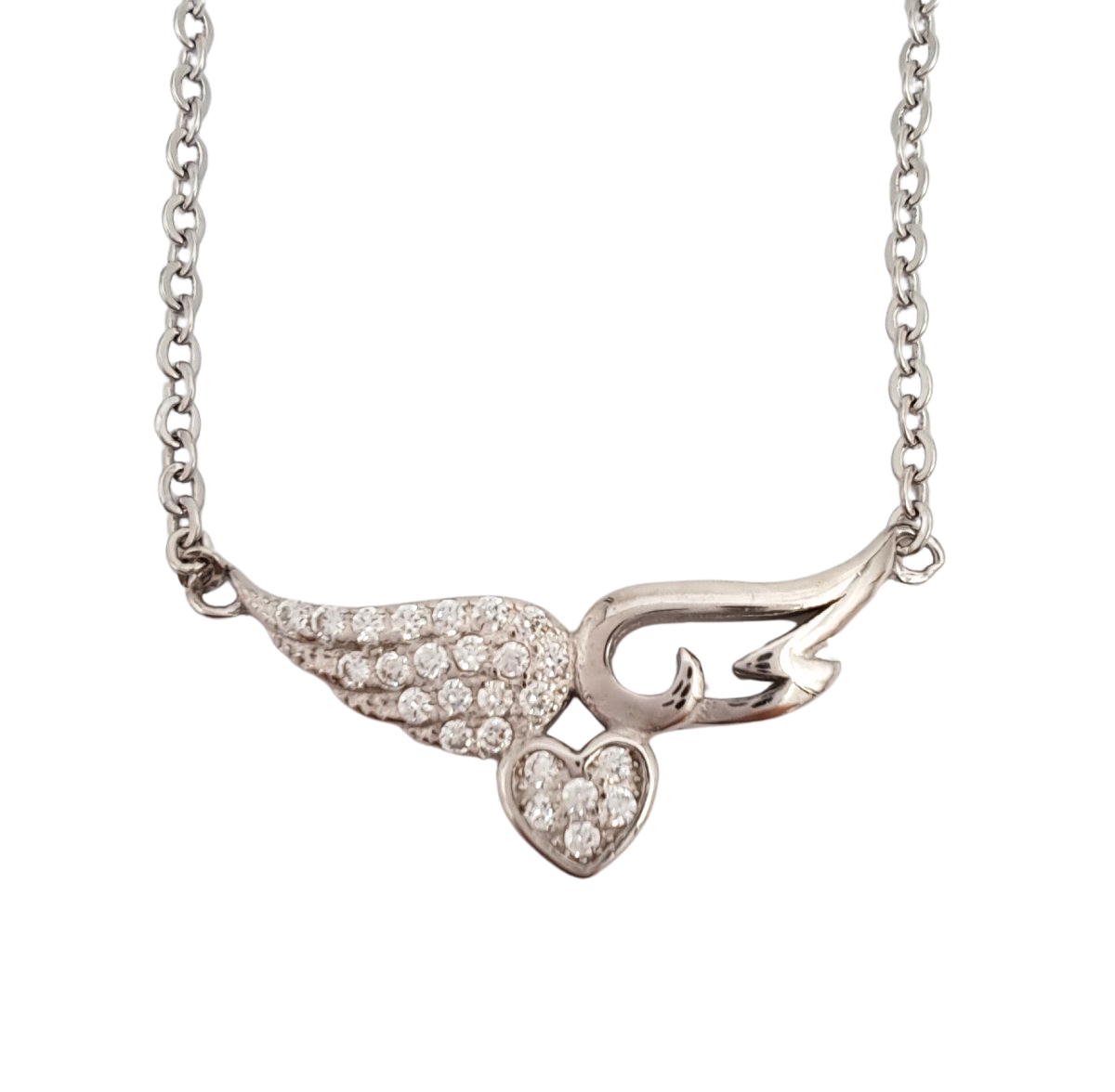 Ihastuttava kaulakoru, jossa on kaksi siipeä. Siipien alla on pieni kimalteleva sydän.