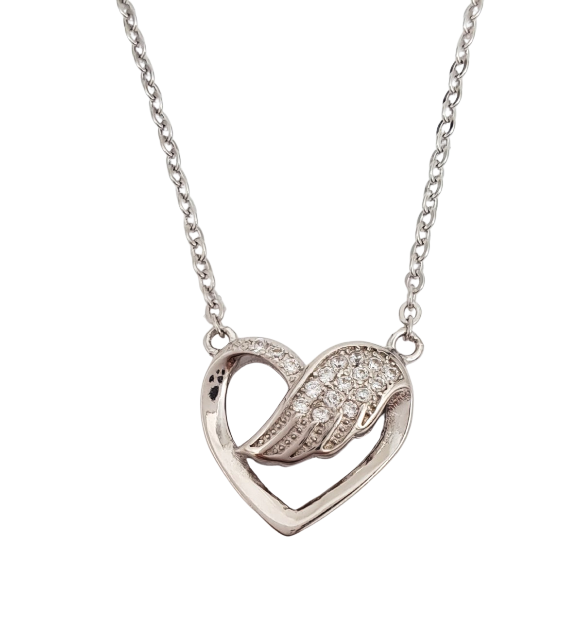 Ihastuttava kaulakoru, jossa sydämessä koristeena siipi. Sydämessä kirkkaita zirkoniakiviä.