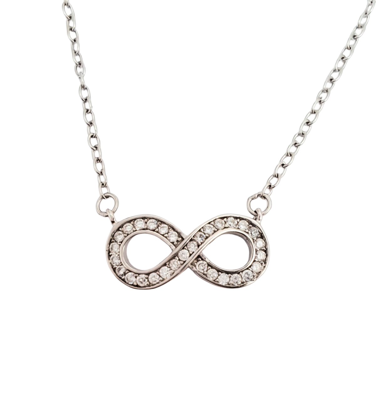 Ihastuttava kaulakoru, jossa ”Ikuisuus”-symboli. Koristeena kirkkaita zirkoniakiviä.