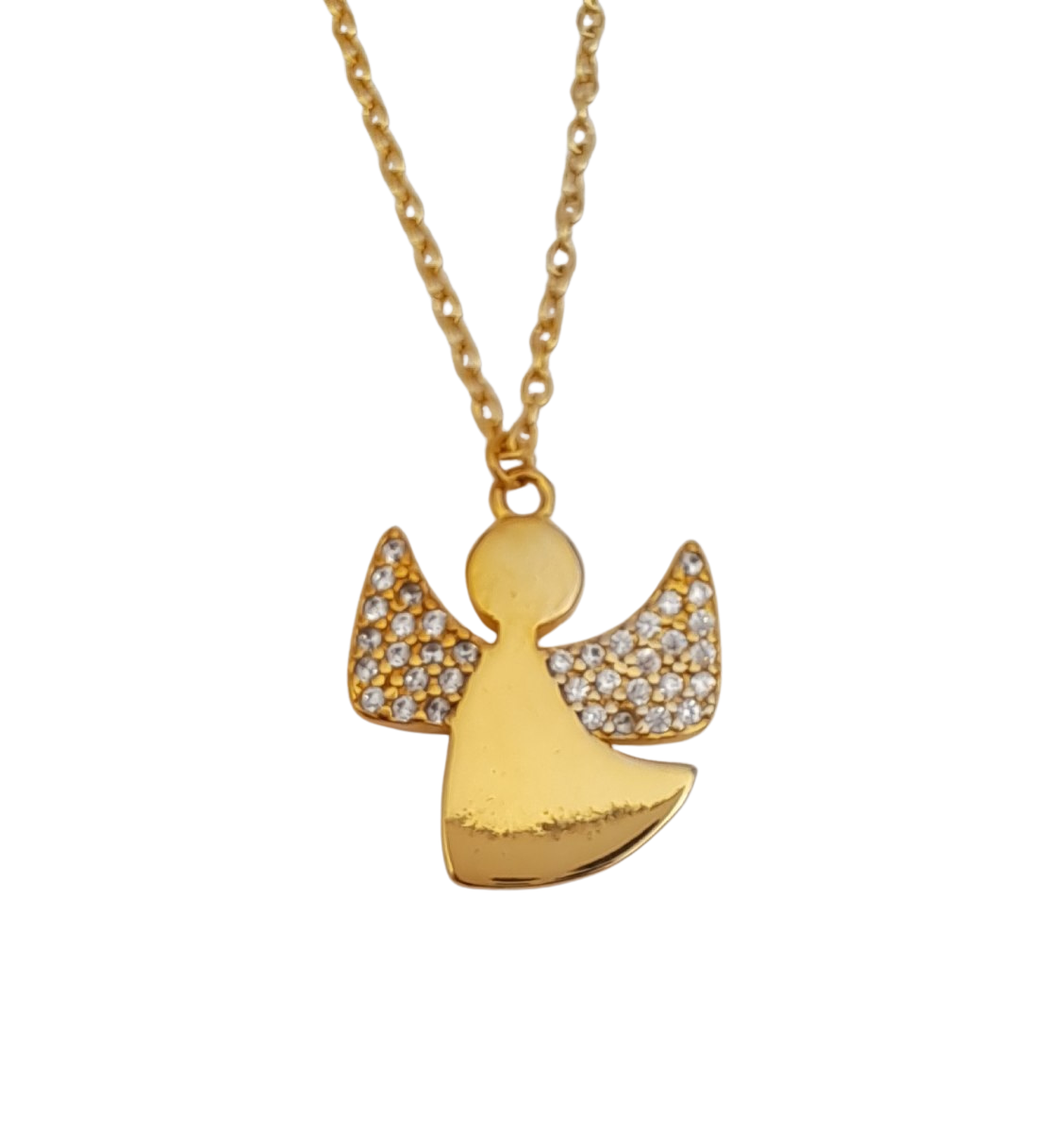 Ihastuttava kaulakoru, jossa enkeliriipus. Enkelin siivissä kirkkaita zirkoniakiviä.