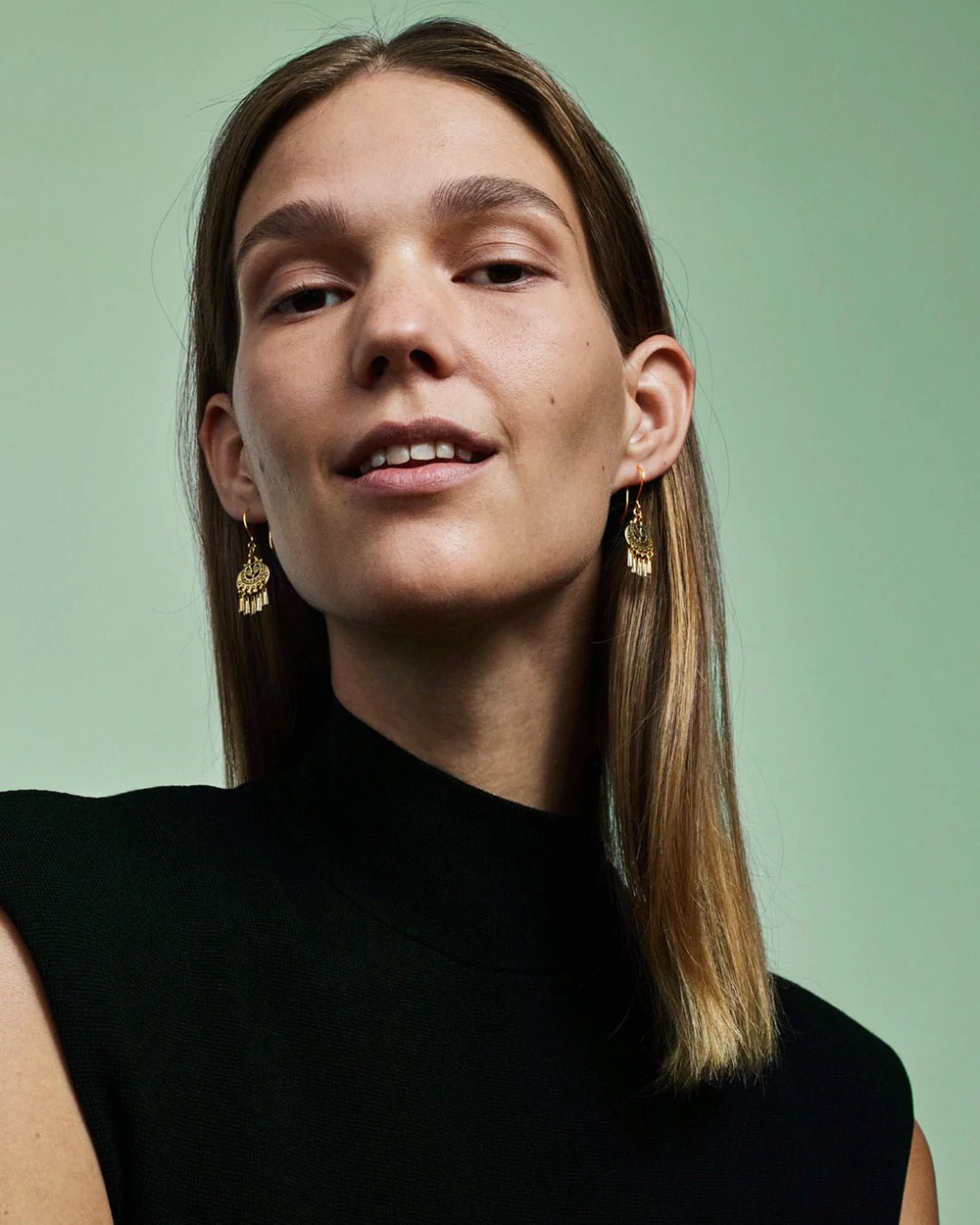 Germund Paaerin 1940-luvulla suunnittelema Kuutar on klassikkokoruistamme se kaikkein ikonisin. Viikinkihenkisten pronssisten korvakorujen spiraalit symboloivat elämän kiertokulkua, ja pienet helat karkottavat helinällään pahoja henkiä. Avokoukut kullattua hopeaa. Saatavissa myös kultaisina ja hopeisina. Korvakoruista on myös isompi versio.