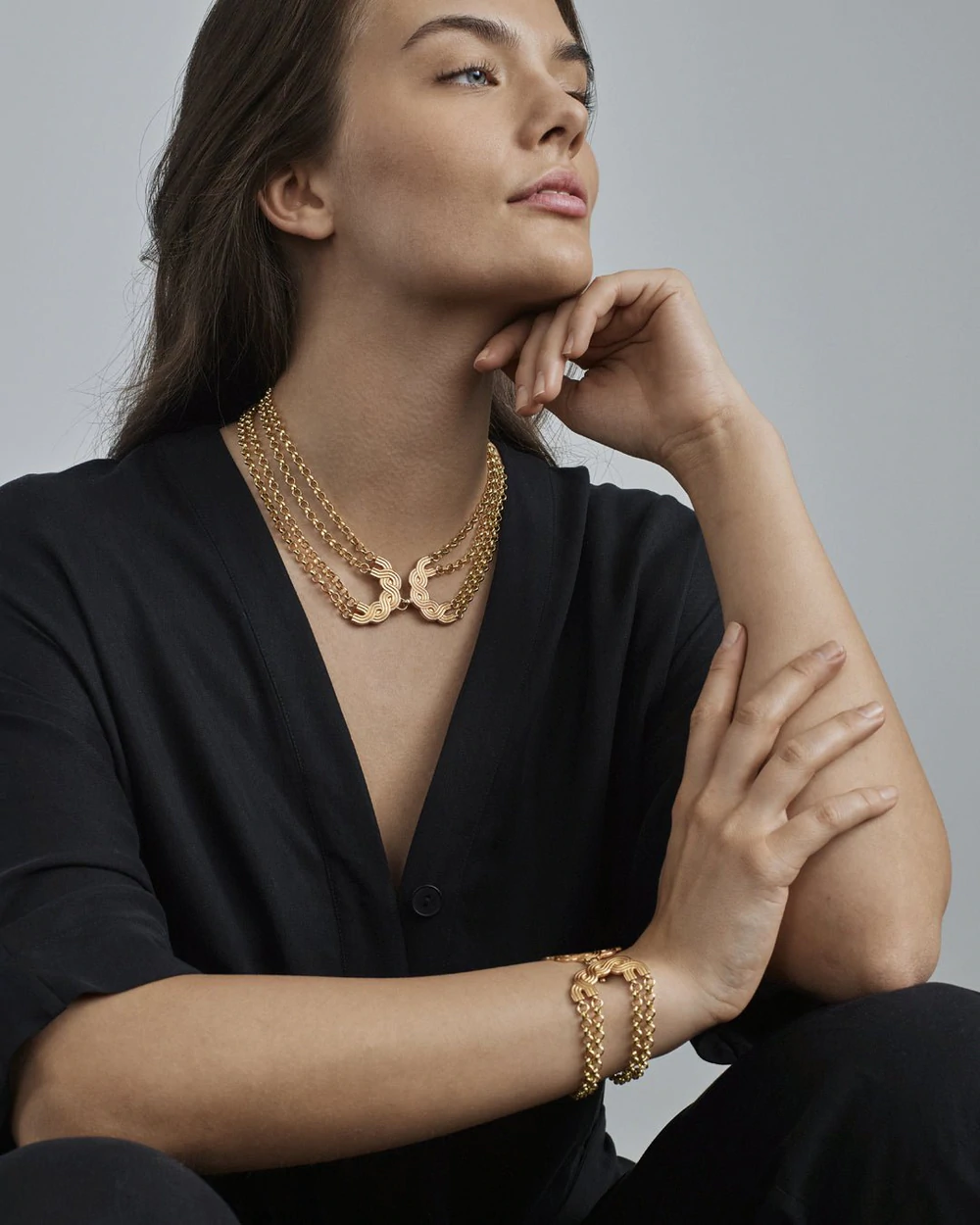 Lämpimästi hohtavasta pronssista tehdyn Louhetar-kaulakorun nauhapunoskoristeita yhdistää neljä papuketjua. Nauhapunoskoristeet toimivat kaulakorun lukitusmekanismina, ja voit muunnella korun ilmettä lukitsemalla koristeet niskan taakse, eteen kaulalle tai sivulle. Pituus 40,5 cm, pituus ei ole säädettävä. Saatavissa myös pidempi versio (47 cm).