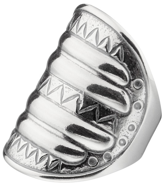 Leveä hopeinen kilpisormus kapenee taakse ja on jätetty takaa auki, mikä mahdollistaa sormuksen koon säätämisen aavistuksen verran. Perniöstä löydetyn rautakautisen sormuksen mallin mukaan tehty Kalevala Originals -klassikko sopii niin naisille kuin miehillekin.
