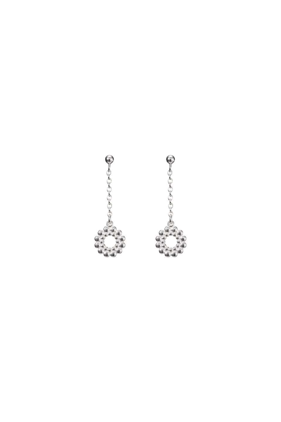 Riippuvassa korvakorussa pieni Valoisa-riipus (samankokoinen kuin sarjan pienin riipus, halkaisija 11 mm, kuvioitu molemmin puolin) keinahtelee kepeästi pallotappiin kiinnitetyn ohuen ovaalipapuketjun päässä.