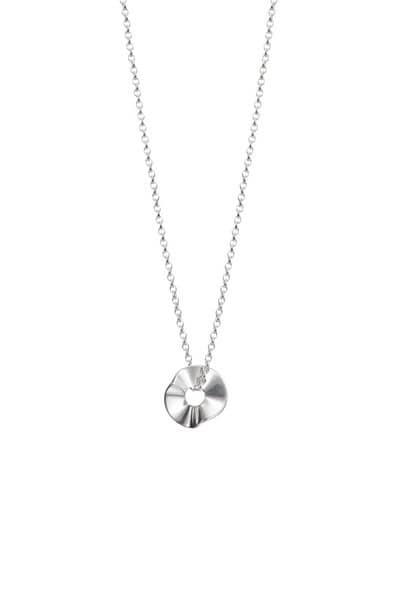 Pyöreän riipuksen (halkaisija 16 mm) sulavasti aaltoileva muoto saa valon ja varjon leikkimään korun kullanhohtoisella pinnalla. Korussa voi nähdä vaikutteita arkkitehtuurista, modernista kuvanveistotaiteesta ja muodin maailmasta. Ovaalipapuketjussa säädettävä pituus 42/45/50 cm, jousirengaslukko. Ketju juoksee vapaasti riipuksen läpi.