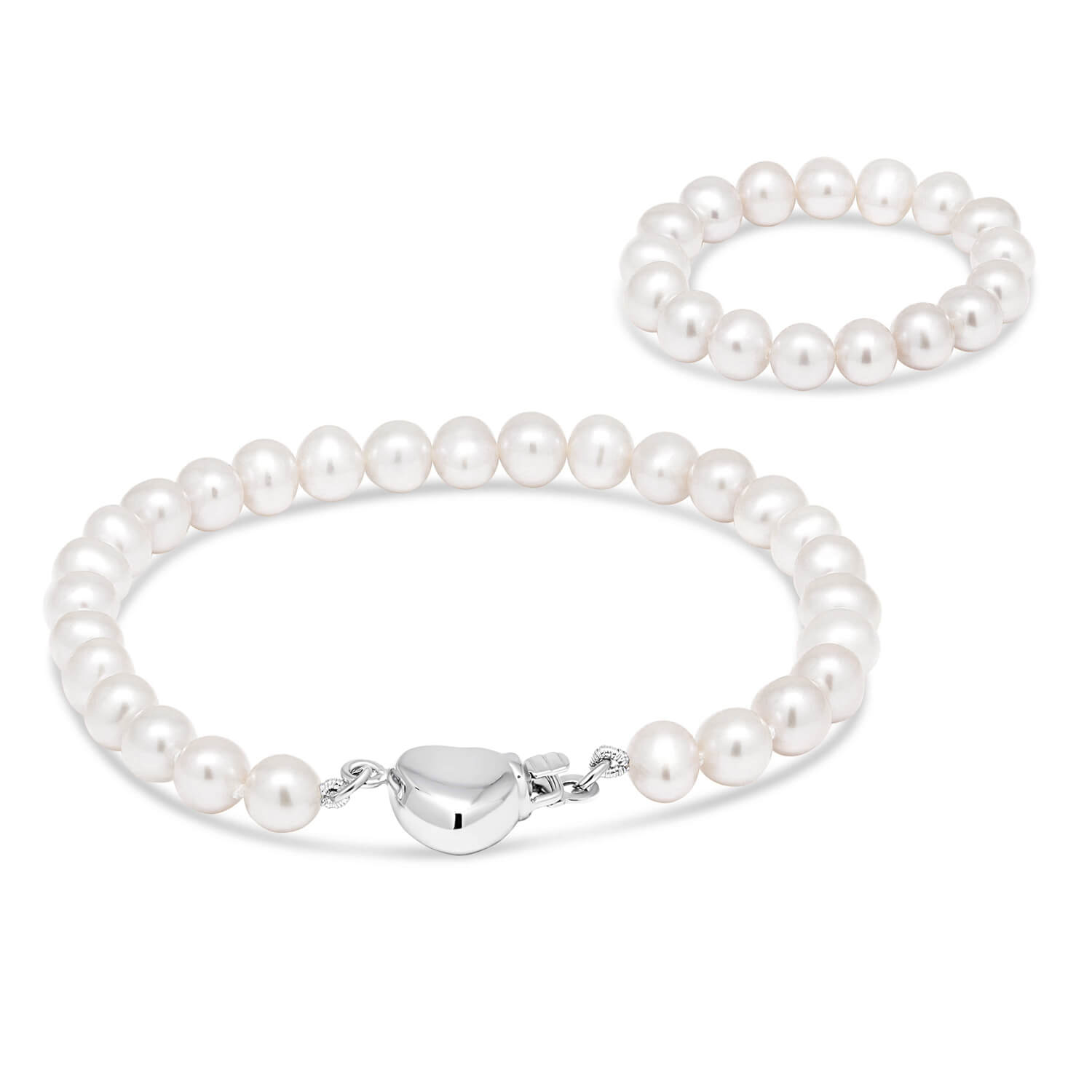 Valkoinen kastehelminauha ranteeseen aidoilla makeanveden helmillä ja hopeisella sydänlukolla.