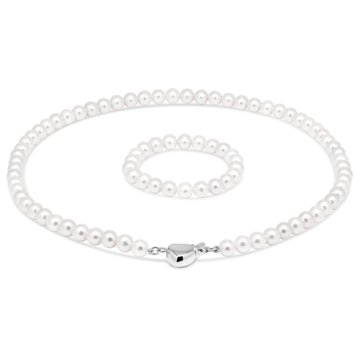 Valkoinen kastehelminauha kaulaan aidoilla makeanveden helmillä ja hopeisella sydänlukolla.