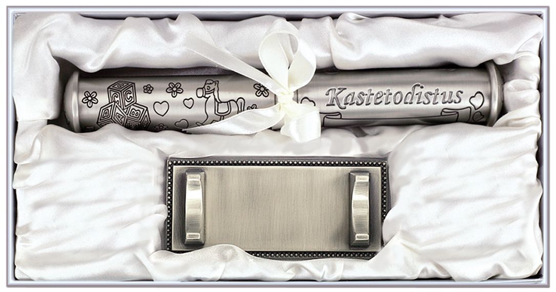 Tähän kastetodistuskääröön lapsen kastetodistus saadaan hyvin talteen ja se voi olla esillä kirjahyllyssä tai vitriinissä kauniina muistona. Kastetodistus putkilo on koristettu kauniilla kuvioinnilla ja putkilosta löydätkin kuvat keinuhevosesta leikkipalikoihin. Kastetodistusputkilon sinetiksi on laitettu kaunis vaalea rusetti, joka viimeistelee kastetodistusputkilon näyttäväksi kokonaisuudeksi. Putkiloon on myös mahdollista kaivertaa esimerkiksi lapsen nimi.