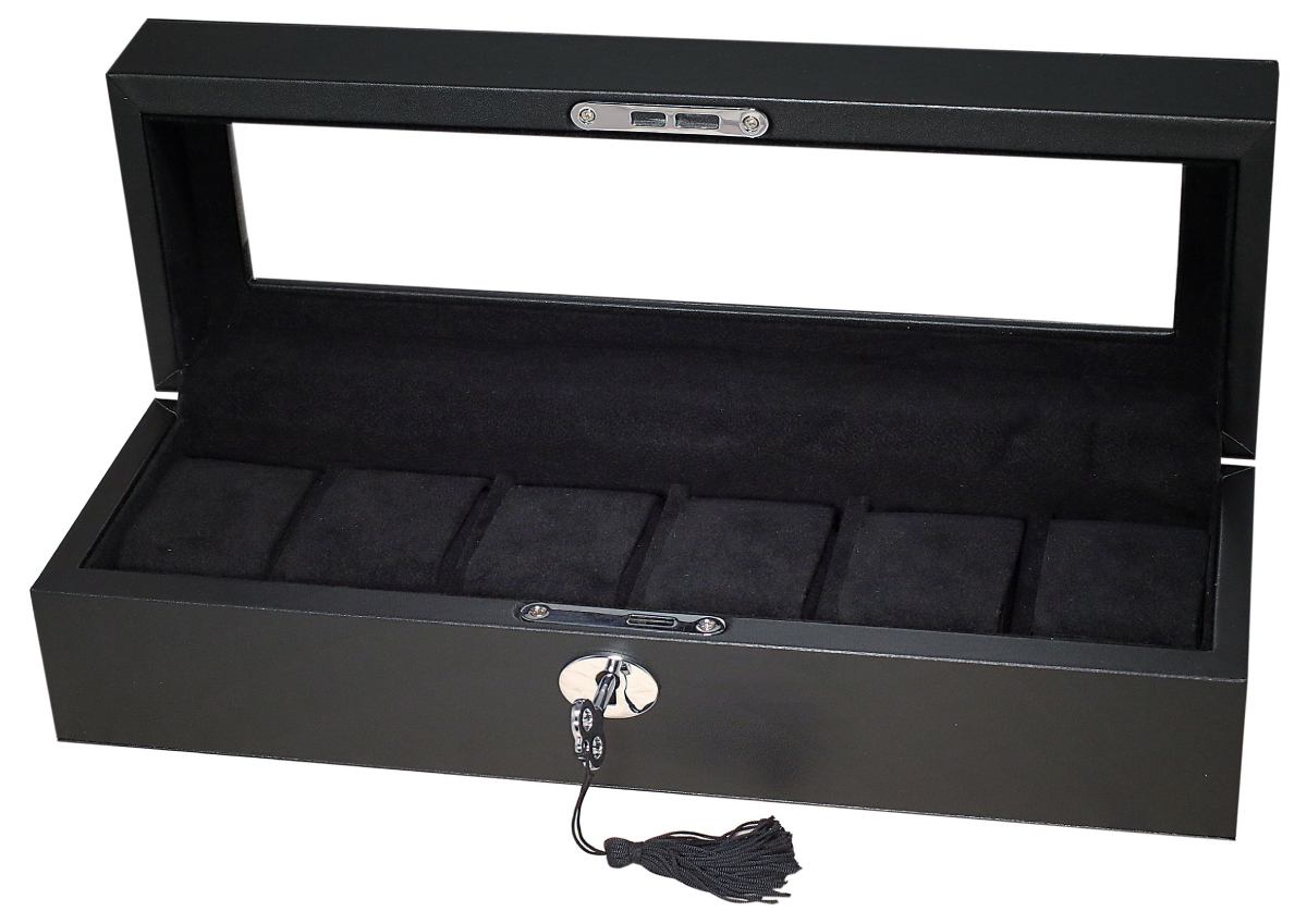 Lipas on mustaa nahkajäljitelmää ja kannessa on lasinen ikkuna. Kannessa on lukko ja avain. Sisäpuoli ja kellotyynyt on verhoiltu mokkamaisella keinonahalla.