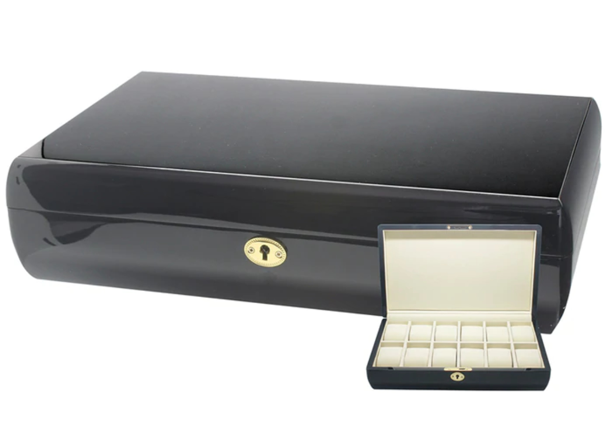Musta kellolipas on tyylikäs ulkomuodoltaan,kiiltävä pinta. Kellolipas on myös erinomainen lahjaidea rannekellojen ystäville! Kuvasta poiketen sisustyynyt ovat mustat. Kellolippaan koko on: 37 x 22 x 8 cm ja yhden lokeron leveys on n. 5 cm.