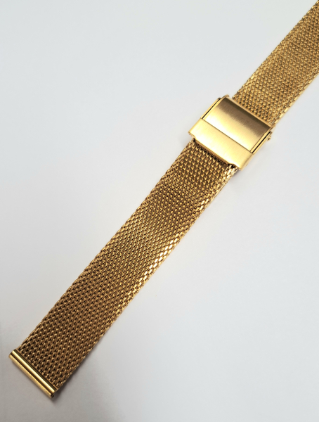 Tyylikäs kullanvärinen teräksinen mesh-ranneke tuplalukolla.