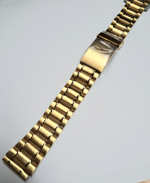 Tyylikäs kullanvärinen teräksinen ranneke tuplalukolla.