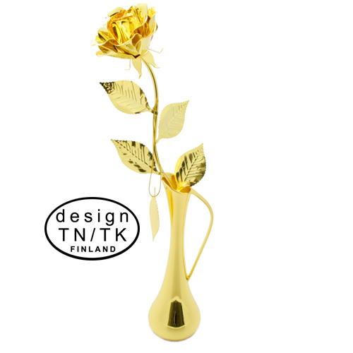 Kullattu juhlaruusu. Settiin kuuluu irtonainen kaiverruslaatta sekä kullattu maljakko. Ruusu ja maljakko toimitetaan läpinäkyvässä lahjapakkauksessa