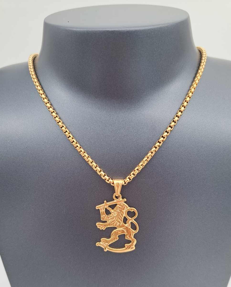 Tyylikäs Leijona-riipus kullattua terästä.
