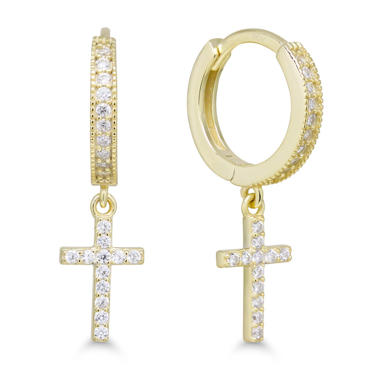 Kullatut hopeakorvarenkaat, joista roikkuvat kauniisti zirkoneilla koristellut ristit.